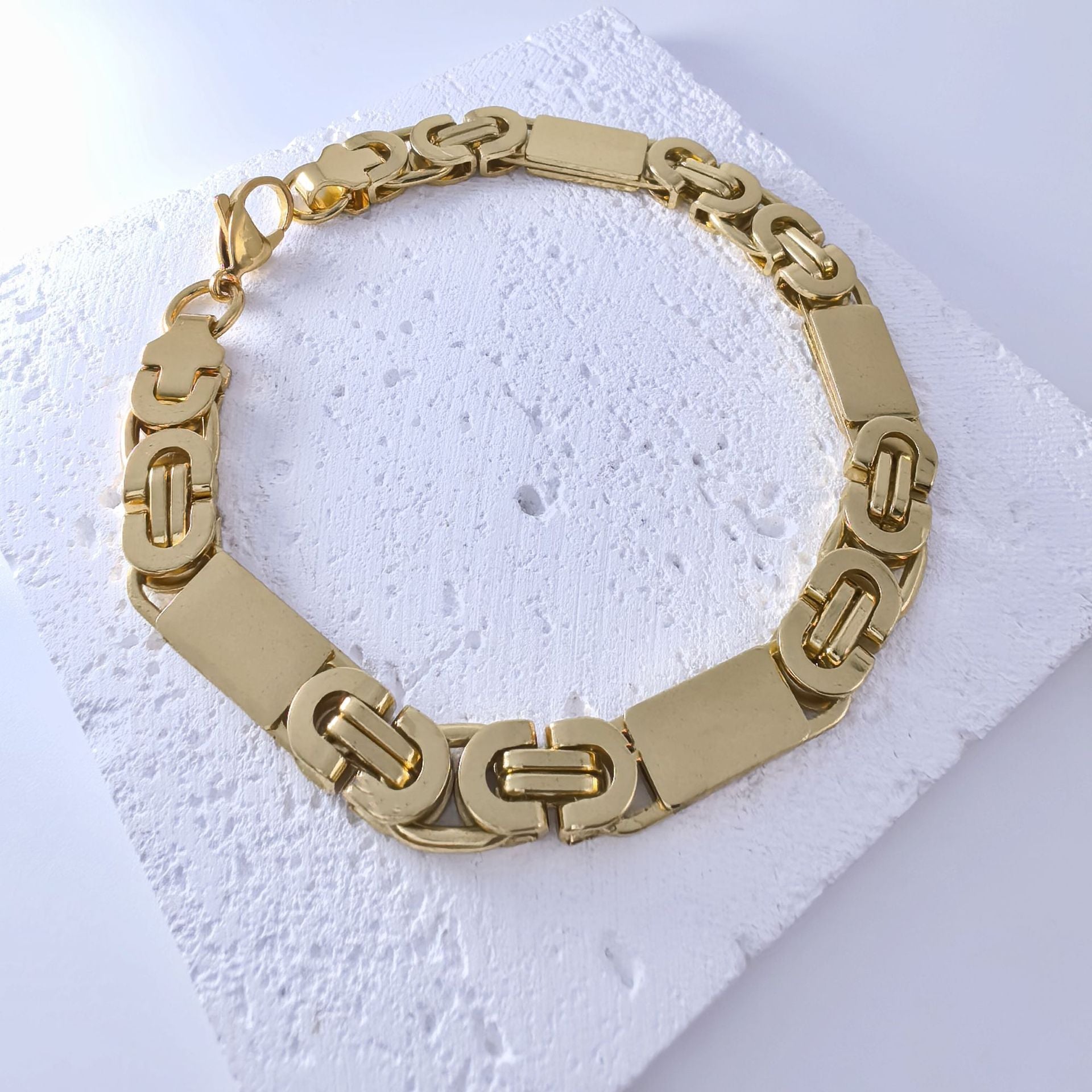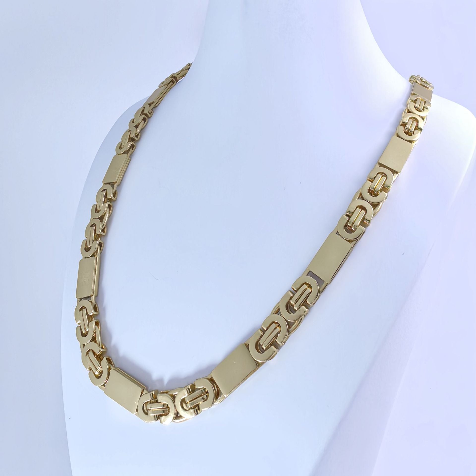 Completează-ți ținuta cu un set puternic și elegant, format din colier și brățară masivă din oțel inoxidabil auriu. Este ideal pentru cei care vor să iasă în evidență.